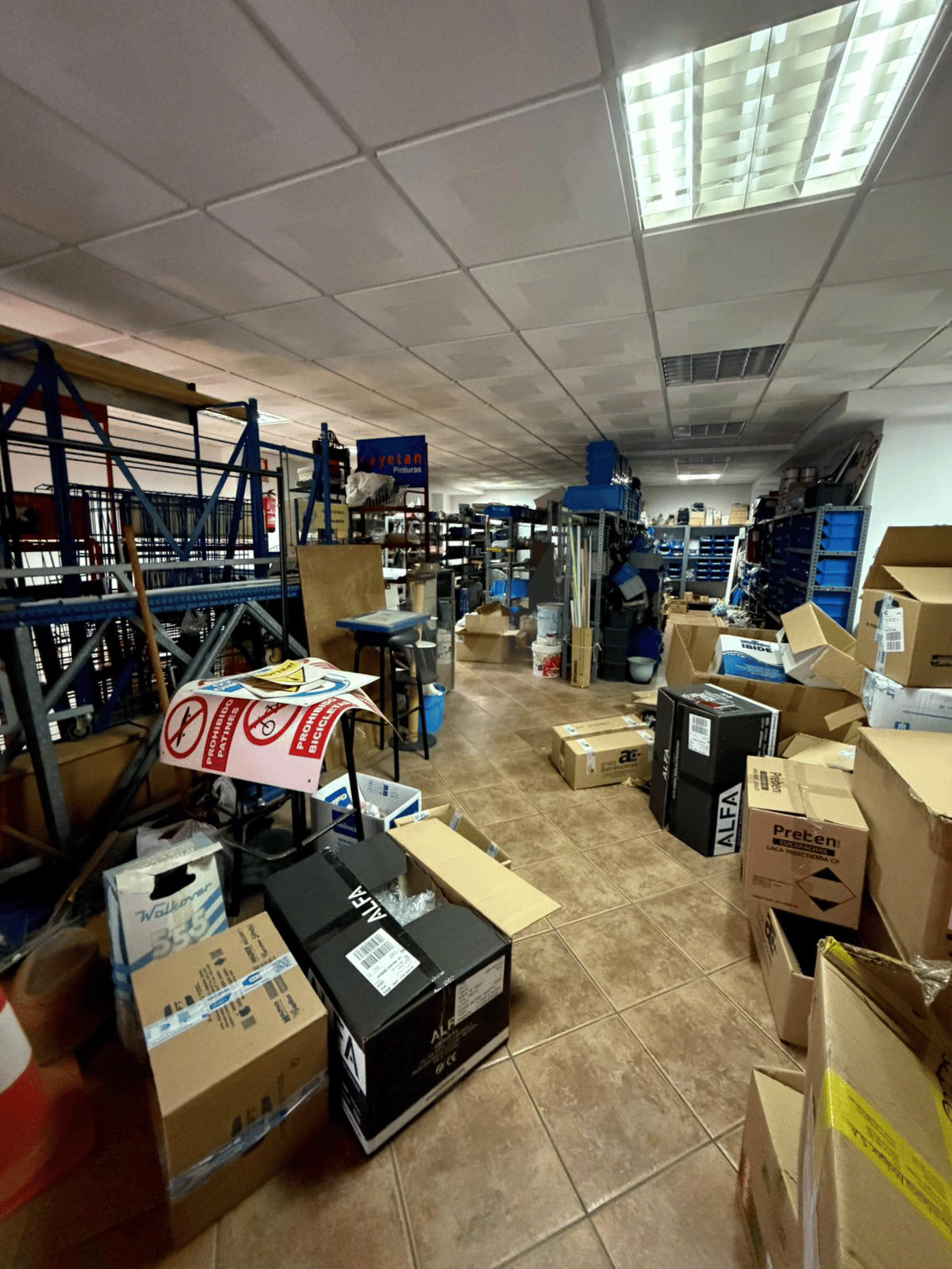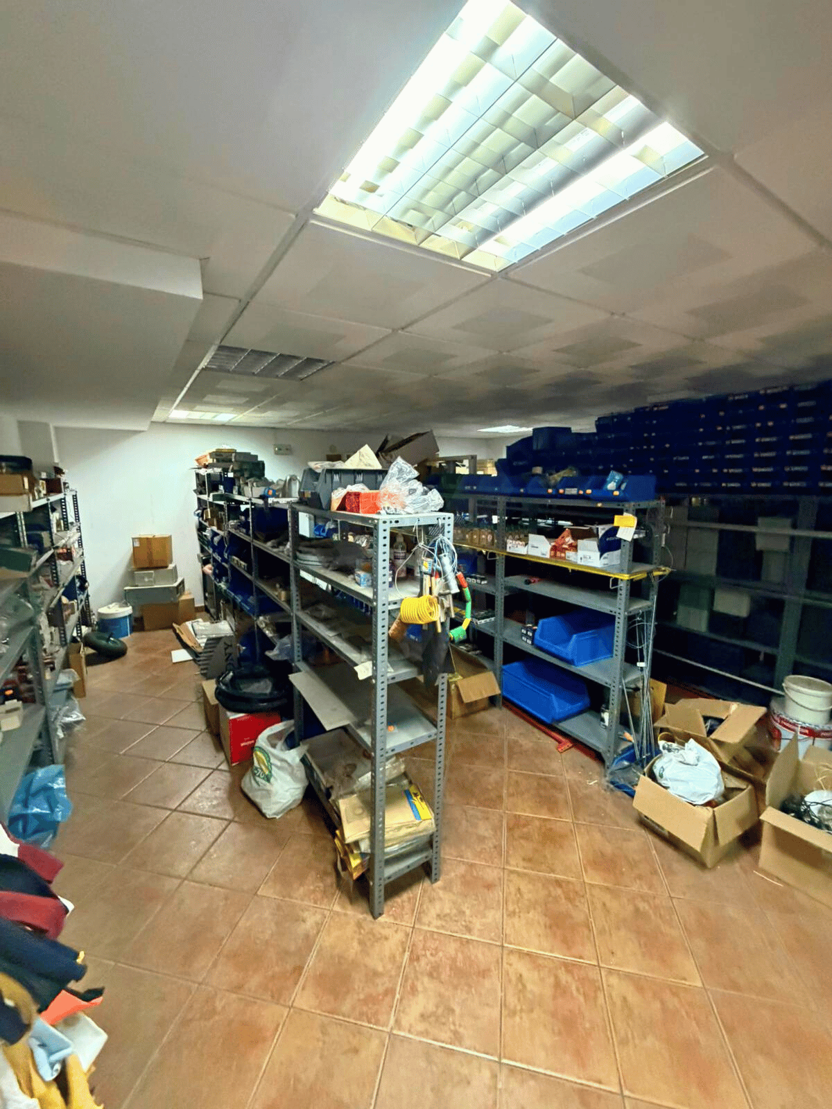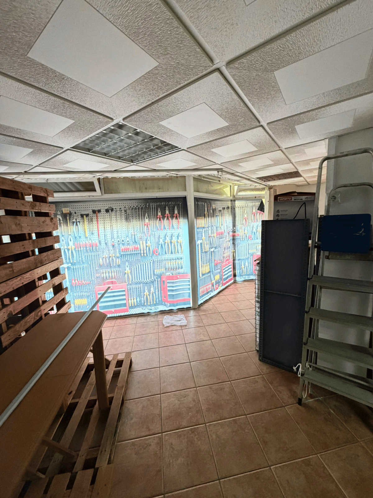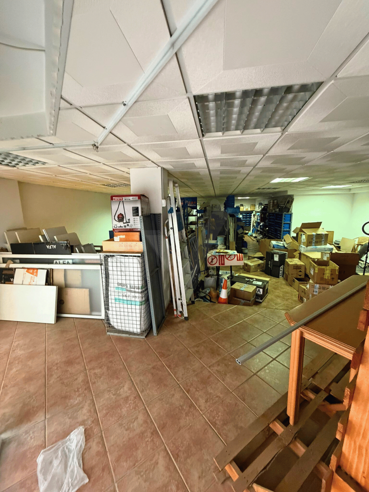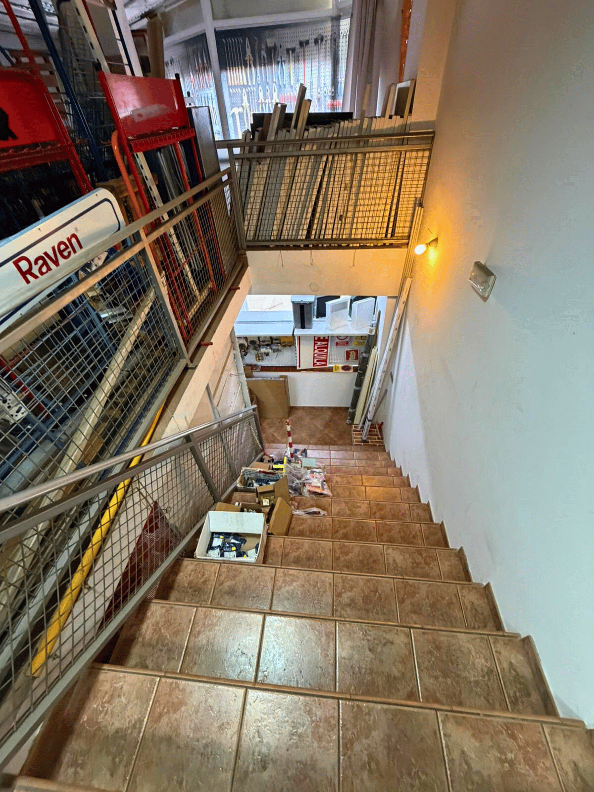 Primera planta con acceso por escalera, equipada con oficina independiente y baño, perfecta como zona administrativa o de trabajo.